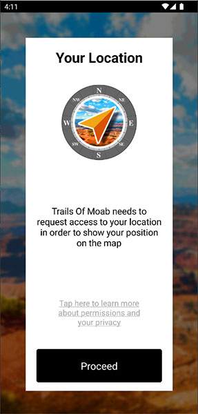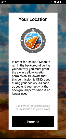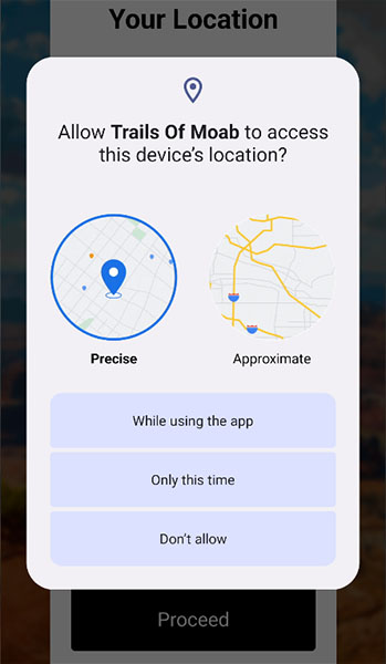 When you click on the 'Proceed' button, your device will then ask you if you want to grant the Trails Of Moab app to be able to access your GPS background location. This prompt will vary depending upon your device, but will look like something similar to the following: