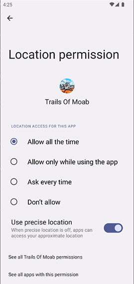 In order for the Trails Of Moab app to be able to track your GPS location during your activity, the 'Allow all the time' permission is required.